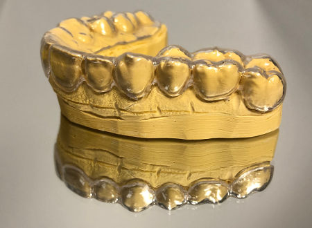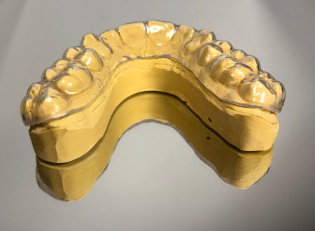 Conseillé pour le bruxisme ou les problèmes d'ATM nous réalisons des gouttières rigides de 1,5mm d'épaisseur thermoformées ERKODENT d'une adaptation et insertion optimale.